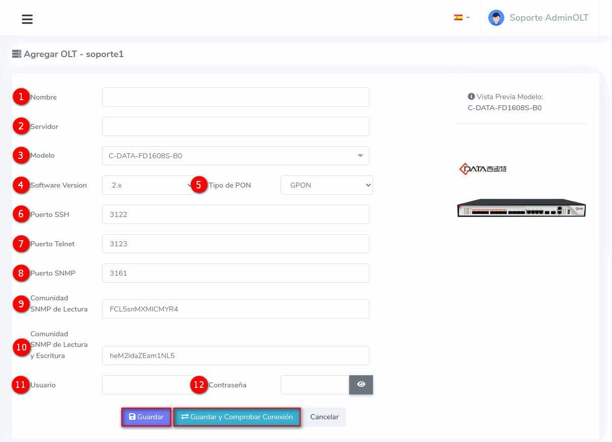 - Nombre: Se refiere a como nombrara a su OLT en el sistema AdminOLT. Este es definido por usted y no afectará a la conexión.