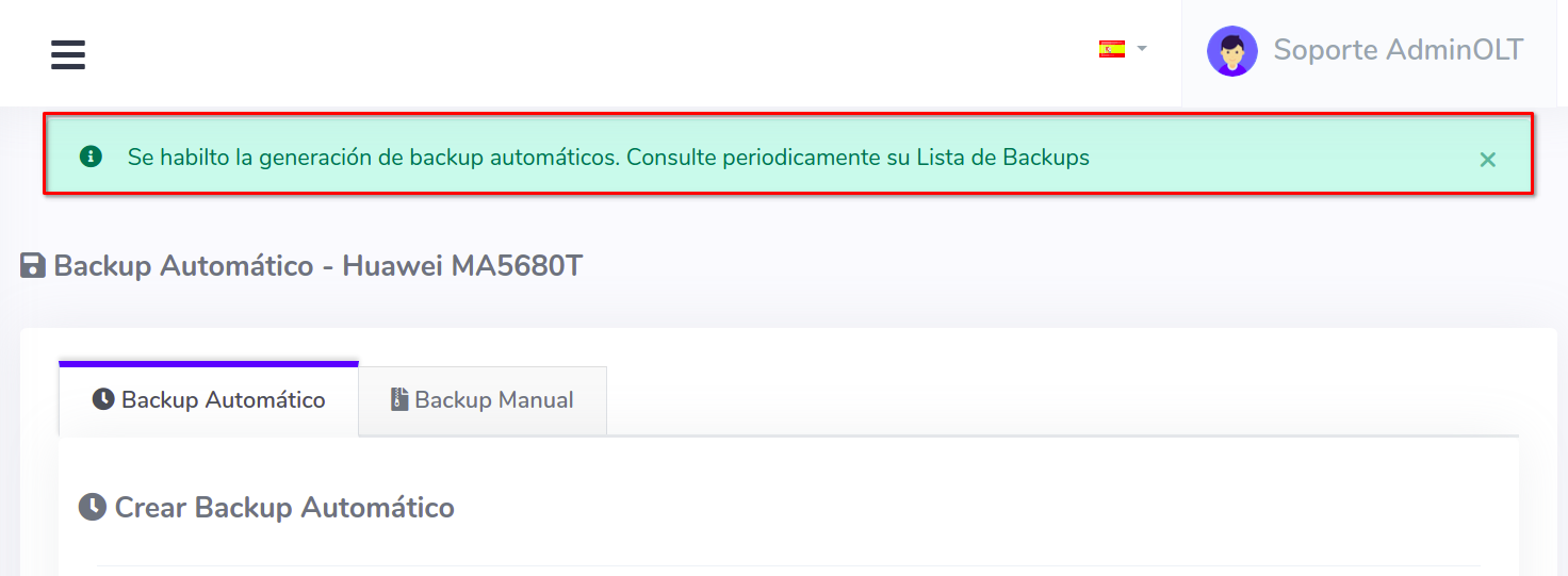 - Tipo de Backup Automático: AdminOLT ofrece: Configuration y Data