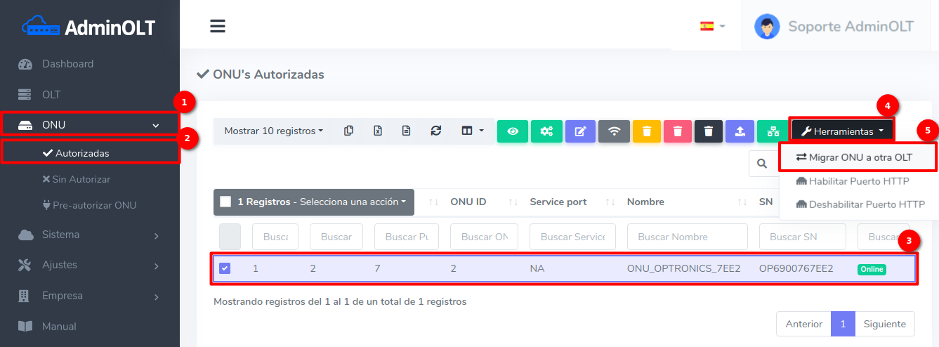 1 En ONU's > Lista de Onu's Autorizadas debemos escoger el equipo con el que se trabajará y seleccionar Migrar ONU a otra OLT que se encuentra en el botón con la leyenda Herramientas.