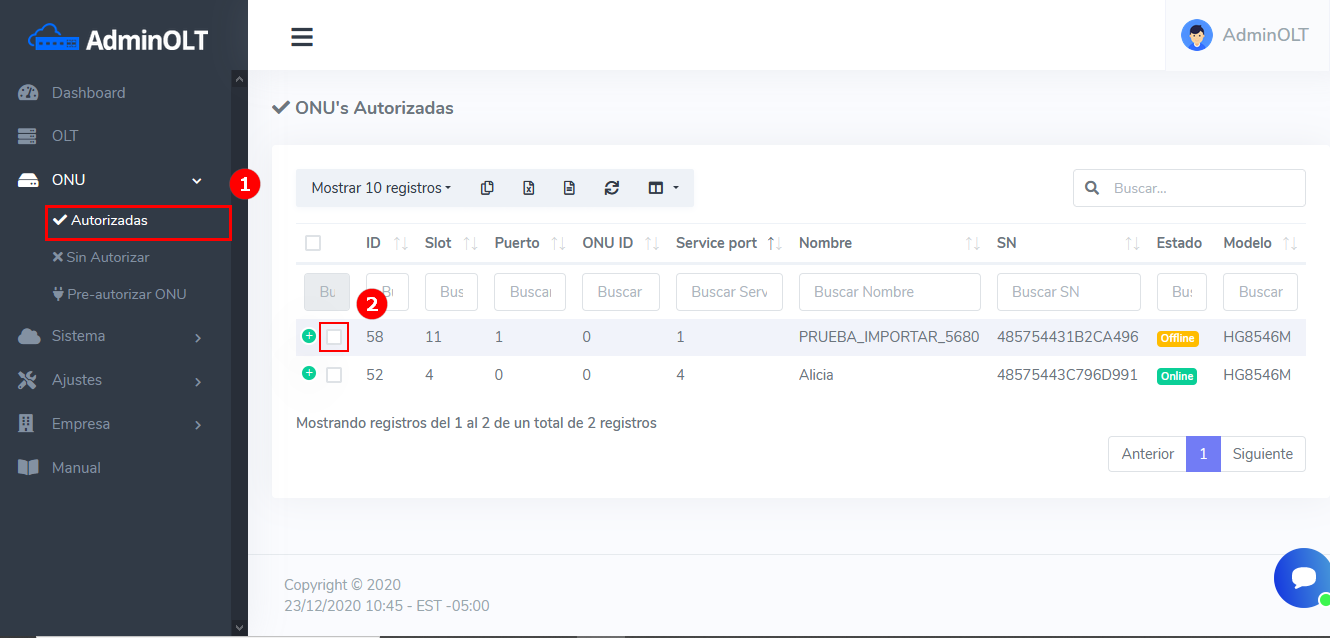 1Nos dirigimos a la lista de ONU's Autorizadas y seleccionamos el equipo que vamos a cambiar de OLT.