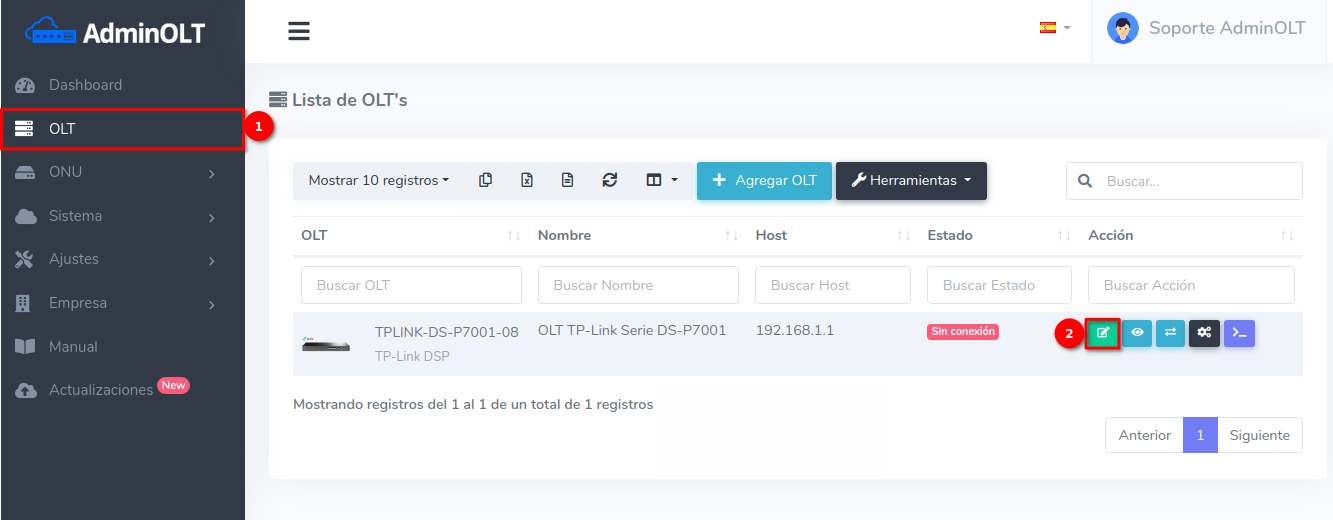 1 En la Lista de OLT's seleccionamos el equipo que deseamos conectar. La OLT ya debe estar registrada en AdminOLT.
