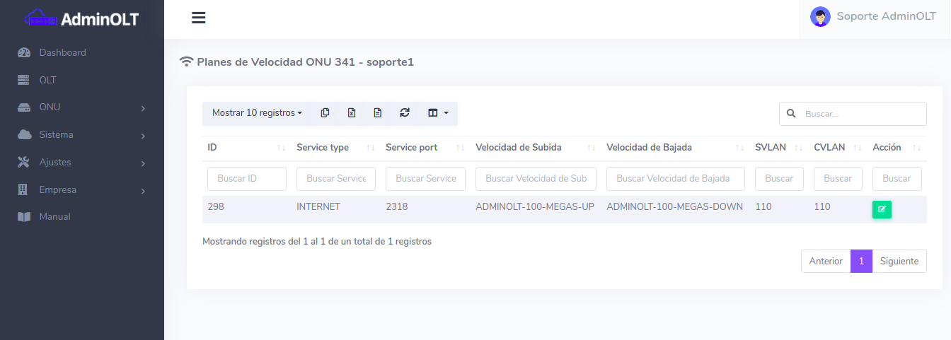 Una vez autorizada la ONU podrán modificar sus planes de velocidad y vlans asociados a los servicios desde la Lista de planes de velocidad.