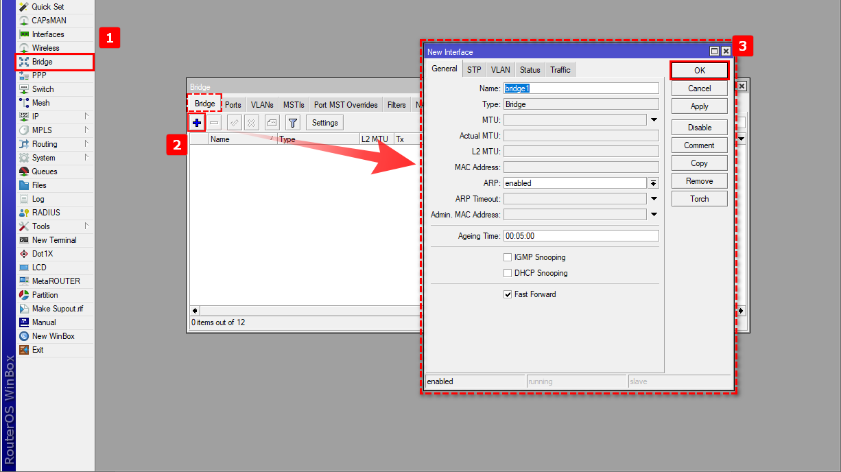 1 Nos dirigimos al apartado de Bridge en el menú de nuestro RouterBoard para generar la interfaz bridge1 y así poder agrupar los puertos que estarán trabajando en la red de la OLT.