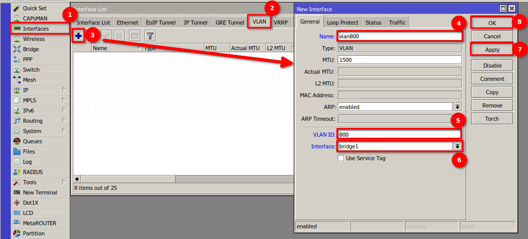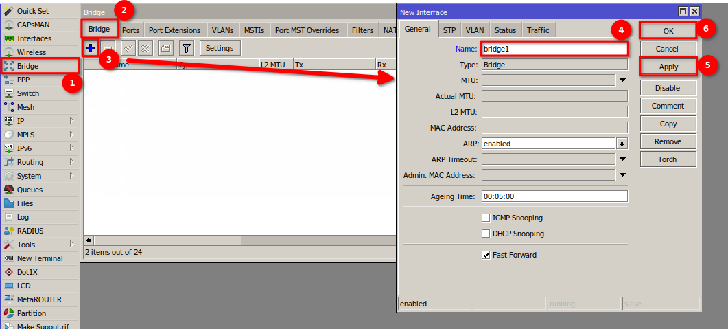 1 Nos dirigimos al apartado de Bridge en el menú de nuestro RouterBoard para generar la interfaz bridge1 y así poder agrupar los puertos que estarán trabajando en la red de la OLT.