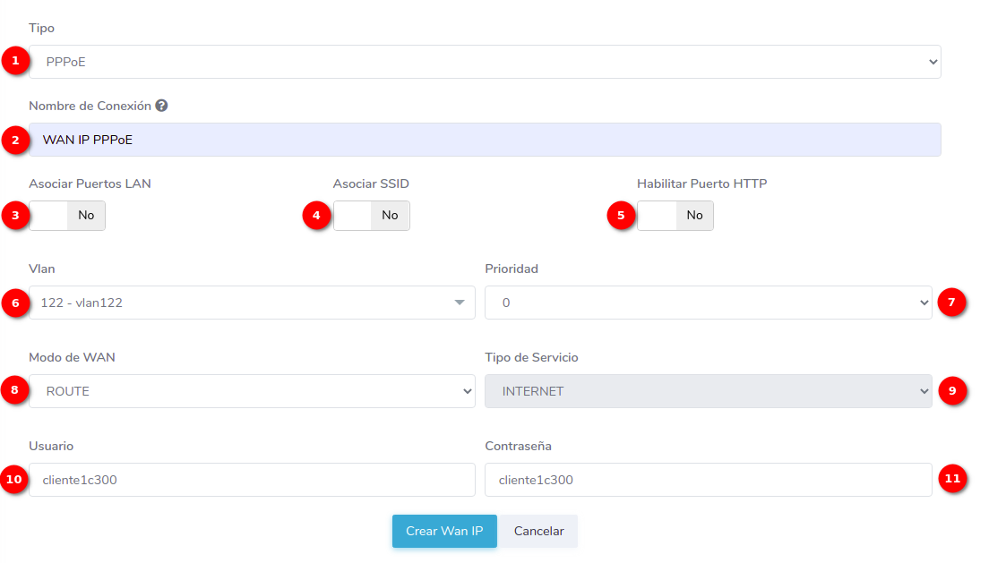 - 1.-Tipo: En AdminOLT se pueden crear configuraciones WAN IP de tipo STATIC, DHCP, PPPoE. En este ejemplo crearemos una WAN IP PPPoE.