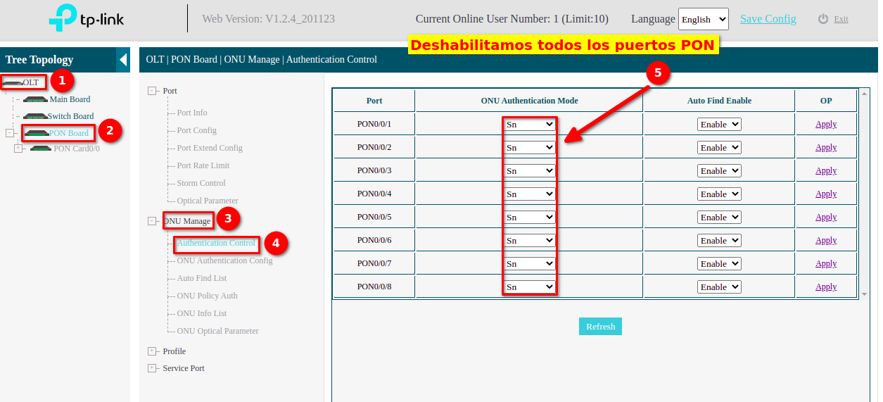 Si desea probar la autorización desde la interfaz de la OLT puede seguir los pasos del manual Configuración Inicial TP-Link utilizando método Manual de ForoISP