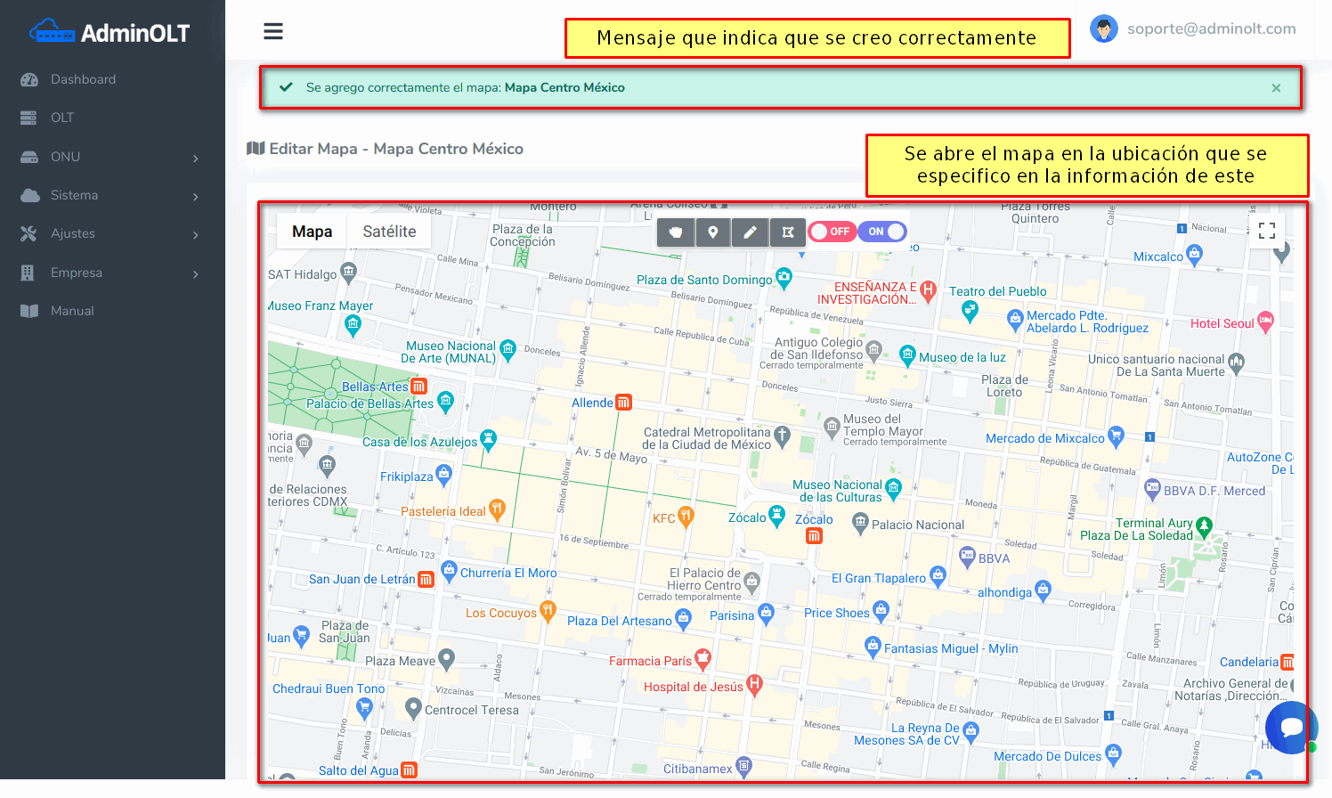 Si al momento de agregar el mapa y abrirlo para editar no se visualiza el mapa de Google Maps puede deberse a que algo esta mal con la configuración de sus datos, favor de leer el articulo ¿Cómo configurar mi AdminOLT para crear Mapas?