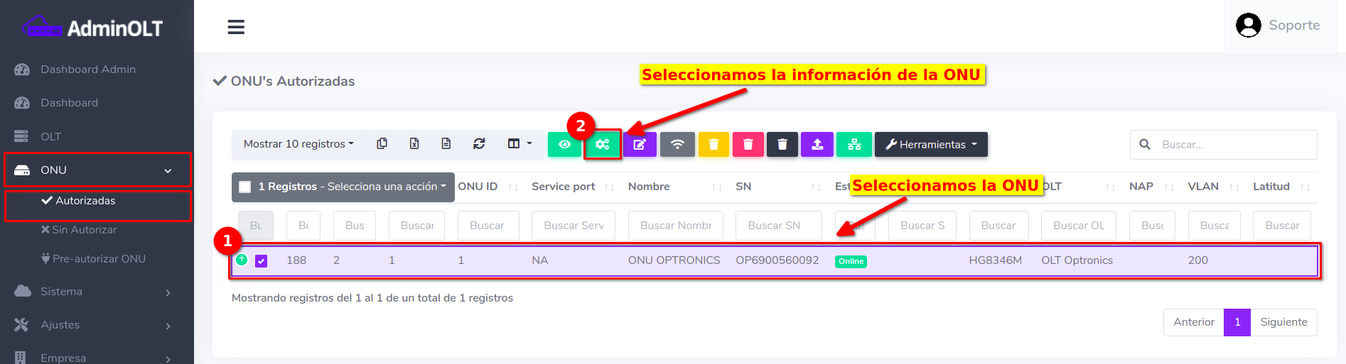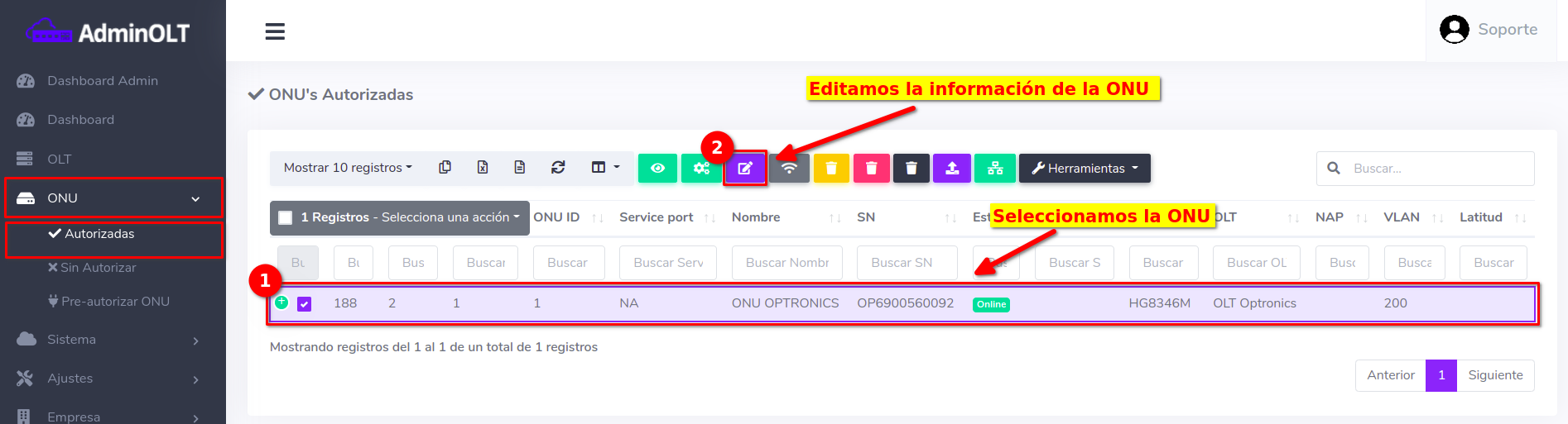 Pasos para editar información de ONU Autorizada en AdminOLT