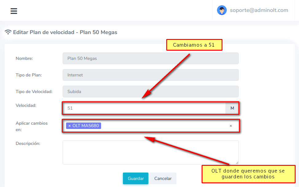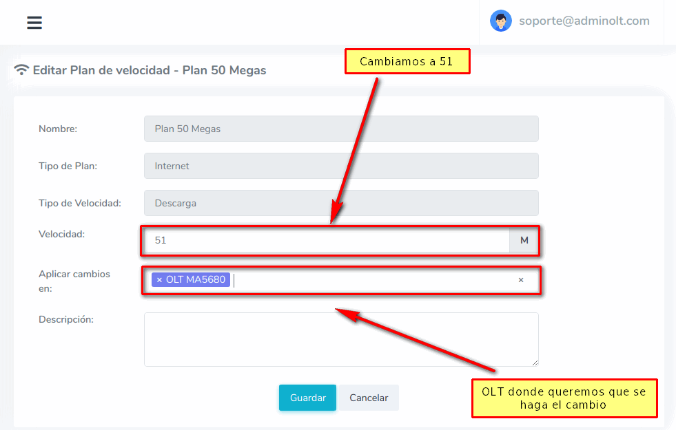 Al modificar un Plan de Velocidad, por ejemplo, de 50 megas a 51 Megas los clientes actuales relacionados al plan se verán afectadas, por lo tanto su nueva velocidad seria de 51 megas.