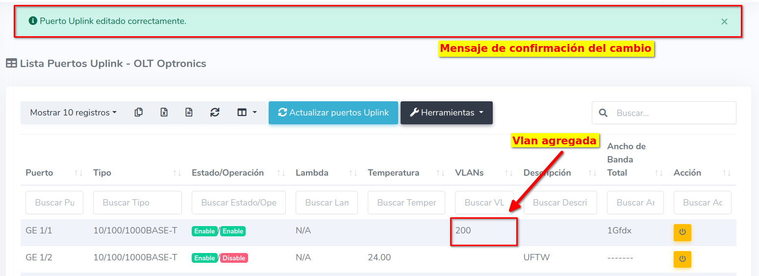 1 En la Lista OLT's seleccionamos el equipo con el que trabajaremos para después ir a Puertos Uplink, que se encuentra en el botón con la leyenda Herramientas.
