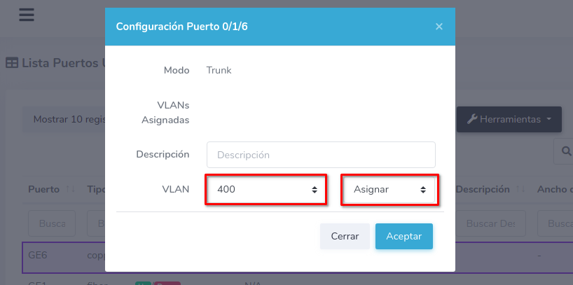 Puede escribir una descripción y escoger entre asignar o remover la VLAN