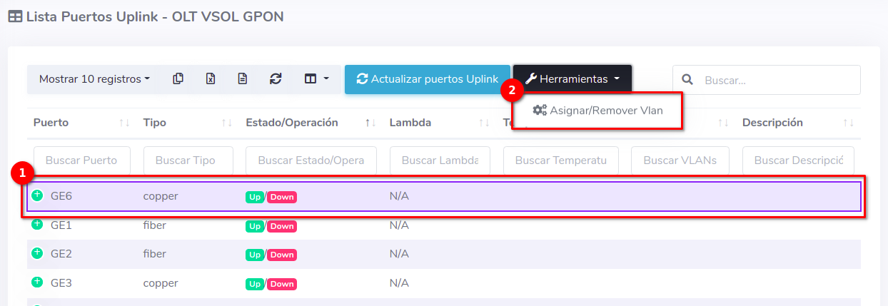 1En la Lista OLT's seleccionamos el equipo con el que trabajaremos para después ir a Puertos Uplink, que se encuentra en el botón con la leyenda Herramientas.