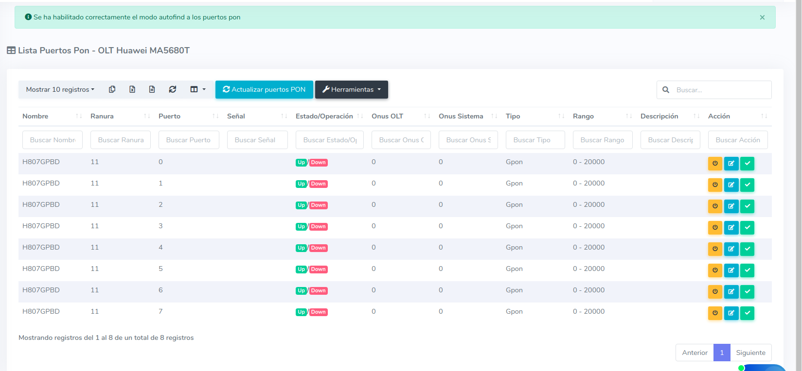 3Una vez que se termine el proceso podremos ver en la vista la lista de puertos disponibles en nuestra OLT.