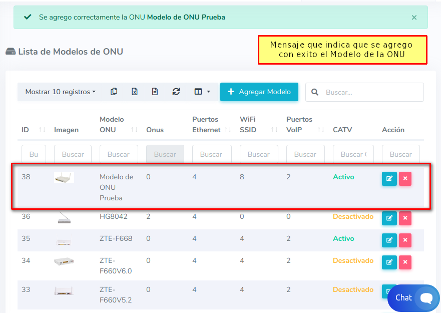 2 Una vez en la Lista de Modelos de ONU. Esto nos mostrara una lista con todas los Modelos de ONU's con las que contamos actualmente en AdminOLT. Para agregar un nuevo Modelo de ONU debemos seleccionar la opción Agregar Modelo.