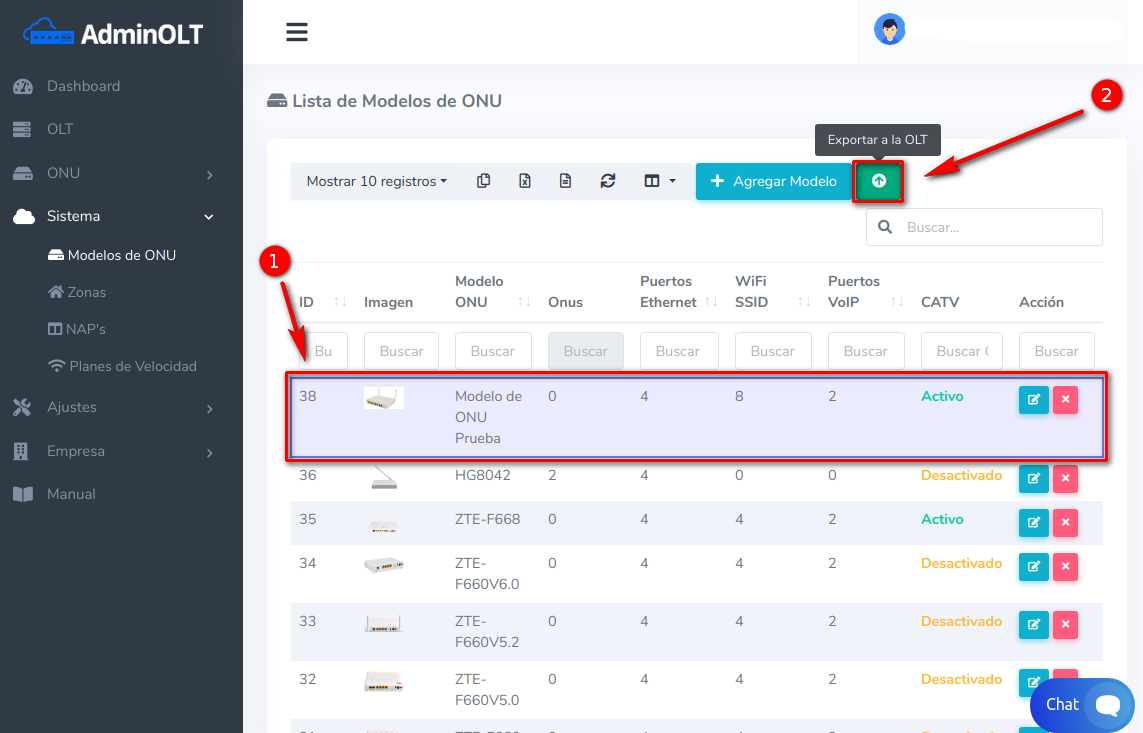 2 Escogemos el Modelo de ONU que deseamos exportar a la OLT y escogemos la opción de Exportar a la OLT