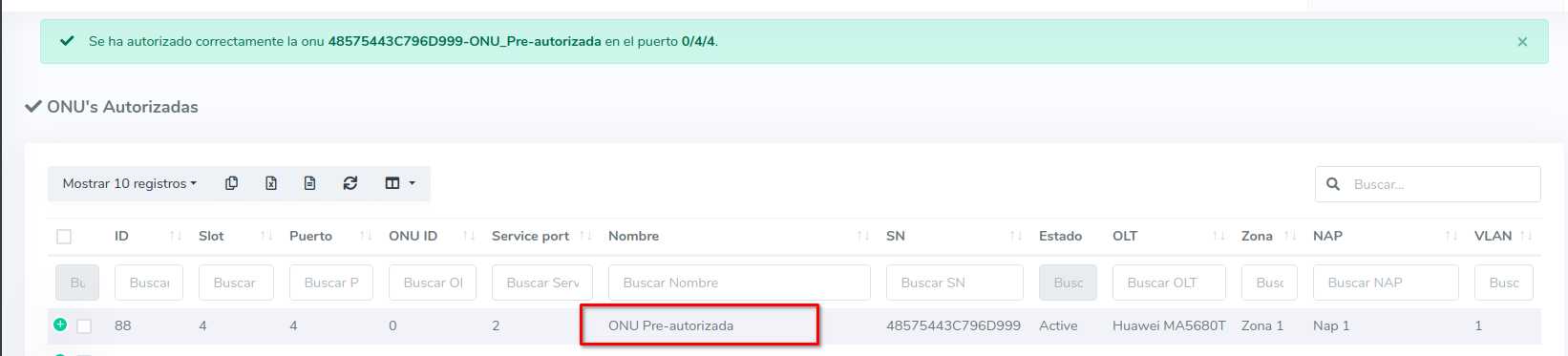 El pre-autorizar una ONU en el sistema, es básicamente autorizar el Numero de Serie (SN) de una ONU que no está conectada físicamente. De esta forma al momento de instalación, solo debe conectarse el equipo.