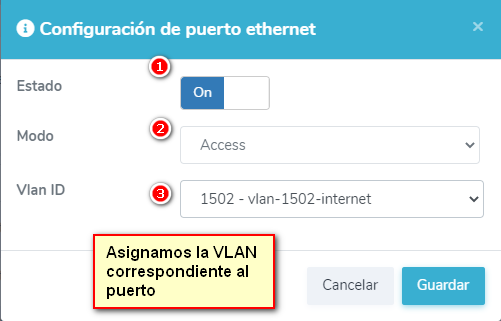 Configuramos los puertos ETH de acuerdo a como seleccionamos la VLAN de los puertos.